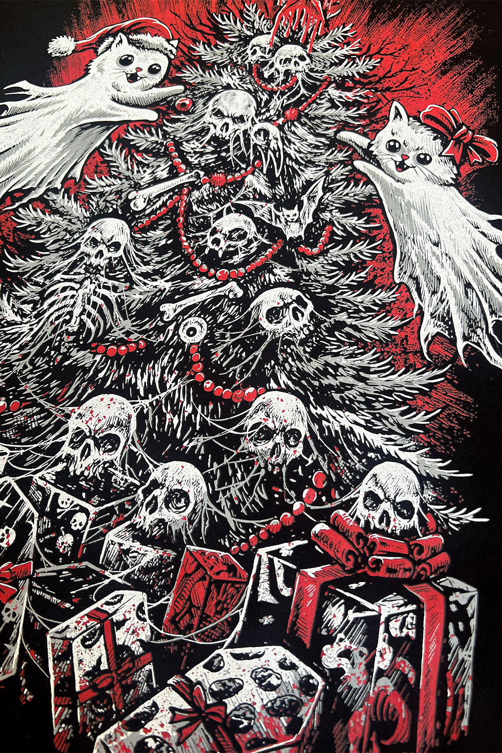 Festive ghost cats and tree on the front. VampireFreaks branding on the back. Blank sleeves. Super soft, wicked warm! Premium quality fabric. Handprinted in the USA!
